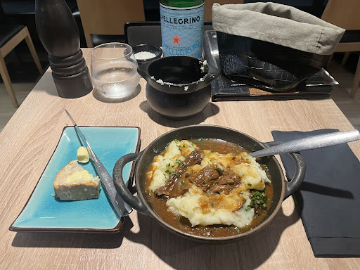 Nous avons pris des moules — à la crème et marinière. À noter qu’une moule était visiblement avariée : goût très fort, presque putride, mais je pense que cela vient d’un défaut à la source, pas de la cuisine. Pour le reste, les moules étaient mangeables mais trop cuites, devenues presque bouillies. Ce qui m’a le plus surpris (et frustré), c’est l’absence totale de goût dans la sauce. Une crème coupée à l’eau, sans saveur — incompréhensible, franchement.