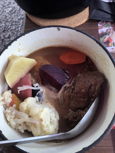 (+) Marmite de viande. 16,80âŹ. ComposĂ©e de joue de porc et de nombreux lĂ©gumes (navets, carottes) dont il faut le souligner, une betterave rouge assez rarement servie chaude. La viande Ă©tait bien mijotĂ©e. Ce plat est gĂ©nĂ©reux et bon.