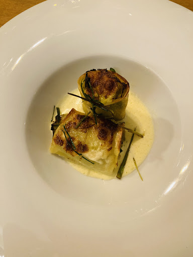 Nous avions, ce soir-là, opté pour des menus Brindilles. Dans nos assiettes nous avons pu déguster des cannelloni de poireaux au haddock puis du lieu noir avec ses moules et son curcuma frais. Nous avons terminé notre repas avec un délicieux dessert café, noix et chocolat qui a ravi nos papilles.