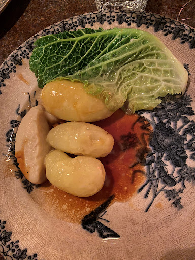 Le plat à partager arrive, et avec lui son accompagnement. J’ai précisé plus haut que nous avions de petits estomacs… Nous aurions pu manger le plat seul facilement, sans partager… Je vous détaille l’accompagnement, car c’est important : ½ feuille de chou, 3 petites pommes de terre grenailles, et une ½ cuillère à soupe de purée de céleri. Même mon estomac a ri en voyant ça.