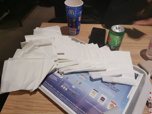 Très déçu du passage. Nous nous sommes arrêtés avec ma conjointe avant de prendre un vol pour nos vacances. Nous passons une commande sur une première borne, celle-ci est défectueuse (pas de possibilité de scanner sa carte de fidélité car le lecteur de code barre est HS) Après avoir passé commande à une seconde borne, aucun ticket ne sort (ni celui de la commande ni celui du paiement par carte bancaire), bon… cela peut arriver qu’il n’y ait plus de papier dans la machine mais même après avoir averti des équipiers, personne ne s’est manifesté nous avons dû nous t prévenir les personnes qui commandaient qu’il n’allaient pas recevoir leur ticket. Malgré plusieurs demandes aucune personne ne s’est manifestée pour remettre du papier ou prévenir que la machine est en panne. Je commande un 280 sauce aux 3 poivres sans tomates (génial cela n’existe pas dans la ville où j’habite) et là un message signalant que le service à table n’est plus disponible donc tout le monde attend devant les bornes d’encaissement et à plusieurs reprises j’entends des personnes venir se plaindre (il me manque 2 sandwichs, j’ai pas eu mon dessert, pas de sauces et j’en passe…). Une équipière interpelle une de ses collègues en lui disant qu’elle n’a plus de glace pour le Happy Meal à quoi on lui répond « mais un yaourt à boire tu t’en fous » bon…. Je reçois ma commande, ENFIN ! Après 20 min d’attente. Il semble ne rien manquer dans ma commande, HOURRA !! J’ouvre le fameux 280 aux 3 poivres et sans tomates. Je vous laisse deviner la suite: sauce mayo-ketchup (sauce du 280 original) et avec des tomates en supplément. Bref que dire sur ce restaurant… ma conjointe est moi-même avons travaillé pour cette enseigne lorsque nous étions étudiants il y a quelques années de cela et à ce moment là à aucun moment ce niveau de médiocrité n’aurait été accepté par notre direction. Bref si vous souhaitez tout de même vous aventurer dans ce restaurant nous aurons qu’un seul conseil à vous donner, faites demi-tour, il y a un BK a quelques dizaines de mètres où vous pourrez sûrement mieux manger. 1 étoile car on ne peut...