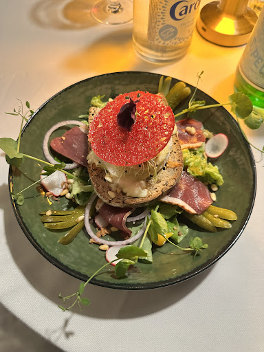 Concernant le service, la serveuse était très gentille, mais clairement pas formée pour un restaurant de ce niveau. Les amuse-bouches n’ont pas été présentés ni débarrassés avant l’arrivée des plats, ce qui a fortement encombré la table. La carte des vins nous a été retirée sans que nous ayons terminé de choisir, et personne n’est venu nous demander si nous souhaitions un vin pour accompagner nos plats. Enfin, le dessert dit “fait maison” s’est avéré décevant : la crème anglaise et la barbe à papa avaient un goût chimique et industriel.