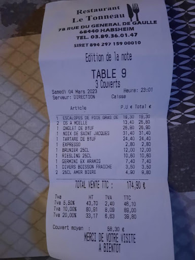 Read moreRead moreWij waren op doorreis, en kwamen op zaterdagavond rond 21.15 uur aan bij "Le Tonneau". De gastheer, gekleed in een T-shirt, lopend op slippers, en een spijkerbroek met veel gaten,begroette ons direct in het Engels, en zei dat als we wat wilden drinken, dat uitsluitend buiten kon. Ik zei dat we (ook) wat wilden eten, en refereerde aan het "menu du jour", zoals aangekondigd op het bord, buiten, bij de ingang, á 16,50. Hierop vroeg hij zich af of we "gitanes" waren, en of we "het wel konden betalen" (?!) Onbeleefd, en ongepast. Wij gingen buiten zitten, en kregen na enige tijd 2 halve liters bier( terwijl ons niet was gevraagd wat voor formaat glas we wensten), en 2 menukaarten ( waarom,vroeg ik me af? "Menu du jour" gaf uitsluitend de keuze uit vlees of vis). De gastheer beschreef een "entree" ( iets met paddestoelen) en een vleesgerecht ( pepersteak) . We gaven de menukaarten terug, en zeiden dat dit prima was. Het eten was uitstekend. Echter, toen ik ging afrekenen, rolde er een bonnetje van 116,60 euro uit. Dát moet een vergissing zijn...? Ik had rekening gehouden met 2 x 16,50 = 33 euro, plus drankjes. Maximaal 50 euro, toch...?! Le patron meldde ons vervolgens dat het "menu du jour" niet besteld kon worden in het weekend, en/ of niet op dit tijdstip, en dat het bord daar bij de ingang er altijd staat, en dat dat heel normaal is. Dat ik duidelijk om 2 x een "menu du jour" had gevraagd werd als niet relevant terzijde geschoven. Ik gaf aan dat we ( zowel hij als ik) wellicht "lost in translation" waren geraakt, en vroeg hem hoe WE dit samen konden oplossen. Vervolgens werd uitsluitend gesteld, dat ik moest betalen, en dat hij anders de politie ging bellen.Hoewel de zaak inmiddels bijna ging sluiten, en er bijna niemand meer was) riep hij dat hij "hier geen tijd voor had"(-voor een, kennelijk, "lastige klant"). Hij volhardde in zijn, nodeloos vijandige en totaal klantonvriendelijke houding, en liep toen weg. Totaal niet oplossingsgericht ,en ronduit onbeschoft. Op Google reviews , zo bleek later, staan een heel aantal soortgelijke ervaringen met deze "gastheer". Jammer. Het eten was goed, maar wel behoorlijk prijzig, net als het bier. De ervaring met de gastheer was duidelijk niet voor herhaling vatbaar. Ik vraag me af, hoe lang hij zijn bezoekers nog zo wil ( kan ?) blijven schofferen. Ik vraag me af, wie de politie als "dief" had aangemerkt. Ik was er te moe voor. Ik was gewoon bereid te betalen, maar kennelijk mag je je onvrede hierover niet kenbaar maken als de prijs ruim 2 x hoger uitvalt, en het onduidelijk is aangegeven en, en "le patron" halsstarrig weigert daarover naar zijn eigen aandeel in het misverstand te kijken. Daarnaast verwacht je niet, als de gastheer zodanig is gekleed als hij, en het "menu du jour" 16,50 kost, dat je de prijs voor "haute cuisine" af...