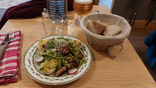Qui croirait trouver au fin fond du Volvestre une brasserie de village dont la cuisine est aussi sophistiquée que celle d'un Bib gourmand ? Espérons qu'un inspecteur Michelin ne s'arrêtera jamais en ce lieu, sinon nous serons obligés de réserver 4 mois à l'avance. Déjà, il faut réserver avant midi pour être certain d'obtenir un des 36 couverts. Le patron, qui oeuvre en cuisine, élève lui-même ses cochons, sa famille lui fournit les volailles. Tout est local. Les cuissons basse température sont...par-fai-tes. Et dire que ce fou demandait seulement 14 € pour un menu complet il y a encore 2 ans ?!... bon, aujourd'hui c'est 18€. Mais c'est pas encore assez cher !... En photo, une entrée "oeufs mayo", mais c'est plutôt oeufs mimosa sur salade de lardons, et le filet de poulet au jus de moutarde et son risotto aux champignons. Une...