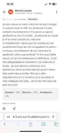 Ni civilitĂ©, ni gentillesse. Cliente fidĂšle depuis des annĂ©es, jâai toujours Ă©tĂ© servie par un monsieur chauve avec des lunettes trĂšs agrĂ©able et commerçant. TrĂšs bonnes viennoiseries et trĂšs bons gĂąteaux, sur ce point il nây a rien Ă dire. Par contre, je suis venue dimanche, il devait ĂȘtre 12h25. Des clients rentraient dans la boulangerie en mĂȘme temps que moi. Ils ont demandĂ© au gĂ©rant qui rangeait les gĂąteaux sâil restait du pain ce Ă quoi vous avez rĂ©pondu : « Non et puis câest lâheure de fermer donc Ă ce rythme on ne va jamais rentrer chez nous » dâun ton trĂšs dĂ©sagrĂ©able. Face Ă son comportement et au fait que personne ne le servait (deux jeunes qui servaient nous regardaient sans savoir quoi faire), nous sommes tous (clients) sortis de la boulangerie sans rien avoir achetĂ©. Cher Monsieur, il va falloir, je pense, apprendre Ă ĂȘtre plus agrĂ©able avec votre clientĂšle. Vos gĂąteaux sont trĂšs bons, il nây a rien Ă dire mais, votre mĂ©tier vous lâavez choisi et vos horaires aussi. Si vous souhaitez fermer, descendez votre rideau mais ne restez pas ouvert pour vous plaindre aprĂšs. En tout cas ce qui est certain câest que vous ne me verrez plus, votre comportement est...