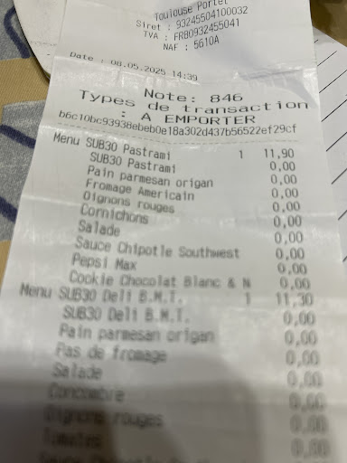 Enfin, et là je vais donner mon avis sur la viande en général de Subway. c'est la deuxième fois que je mange dans un Subway, le premier étant celui de Roques. Sur deux wraps dans deux Subway différents, l'un comme l'autre, la viande n'a pas de goût. ceci est mon avis car pour Mr, il n'avait pas cette impression. J'ai une sensibilité à la nourriture plus élevée donc plus stricte. Mais je passerai mon tour pour Subway. Je laisserai Mr...