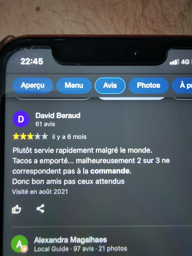 Read moreOn arrive et la porte en très mauvaise état nous empêche de rentrer. Malheureusement à ce moment là on ne savait pas que c'était une invitation à ne pas rentrer. Ensuite ils essayent de nous refourguer une commande qui appartenaient à d'autres gens. Or vu qu'on était seulement 10 dans le tacos il me paraît bien difficile de se tromper. Ensuite après plus de 30min d'attente (10 personnes seulement je rappelle), on a enfin notre commande qui était une commande à emporter. Arrivé à la maison, prêt à déguster notre tacos, quelle fut notre surprise de découvrir l'absence de nos frites. Quelle fut également la stupeur de mon ami qui fut facturé 12€ au lieu de 8. Il se retrouva avec un tacos chèvre miel. Tellement de miel que ça rendrait jaloux tout apiculteur. Et le pom-pom sur le pom-pom, car effectivement nous allons de surprise en surprise quelle fut notre surprise lorsque notre bouche prit feu dans une sauce incandescente plutôt que dans la sauce barbecue...