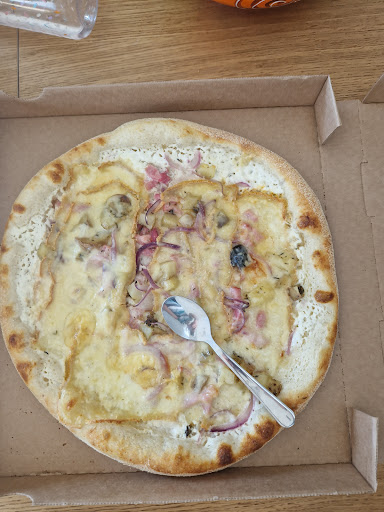 La pâte est très bonne bien que trop cuite pour la mienne et celle de mes fils, mais franchement ça va. Par contre pour ma pizza, j'ai demandé un supplément oeuf, qui était trop cuit, aucun intérêt, il ne coulait pas, sans avoir réchauffé. Mon fils pizza au saumon, inondée de câpres extrêmement salées, le saumon était sec, posé sur le dessus simplement, pas intégré à la sauce, pas émietté, de Gros morceaux posés dessus et non frais, c etait la pire des 4, dégoûtée pour lui... 2eme fils idem, pizza classique avec 3 tonnes d olives jetées dessus, on a l'impression que c'est fait à la va vite, même si c etait bon après tri, tel quel c était non mangeable. Même les pizzas en bas du village qui ont 2x plus de clients et qui ne se vantent pas d'être artisanales sont mieux préparées bien que moins bonnes. Photo a l appui.