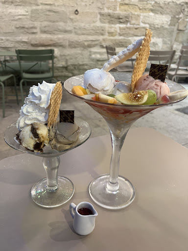 Proposer des coupes de glaces avec 2 ou 3 parfums mélangés avec d'autres ingrédients est une proposition non pas nouvelle, mais remise au goût du jour et osée dans cette profusion d'offre de glaciers vendant des glaces dites artisanales. Ce principe demande un arrangement gustatif délicat pour arriver à l'excellence et c'est bien l'expérience qui nous est proposée. Rien à redire sur ces merveilleuses coupes en verre qui nous arrivent avec le sourire enjoué de la bienveillance. C'est bon, la quantité de sucre est parfaitement maîtrisée pour ne pas dominer en bouche et laisser un gout âpre qui a souvent du mal à partir nécessitant plusieurs verres d'eau pour calmer cette sensation. Rappelons que le sucre permet également à la glace de ne pas trop geler, donc il n'est pas forcément facile de le diminuer.
