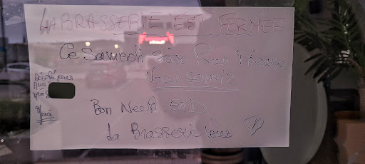 Sur la porte s'affichait une feuille "La Brasserie est fermée ce samedi soir pour mieux vous servir" avec écrit en petit sur la gauche : "Désolé pour Mme * Mme [Nom de réservation]"