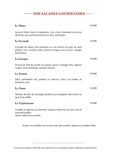 Read moreWe spent five weeks in France (and about five days in Nîmes) and this was one of our top three favorite restaurants, and probably the best price-quality deal of the trip. We came for lunch twice. Get a salad--my husband said, while watching me eat mine our first time here, "this is the only time I've ever been jealous of someone else's salad," and he got his own when we came back two days later. The staff were all lovely. They remembered us and managed to seat us right away even though they were very busy and there were six of us. From the outdoor tables you can see the side of the Maison Carré about thirty yards away, and I don't know what more you could want for atmosphere. We hope to visit Nîmes again and will definitely...