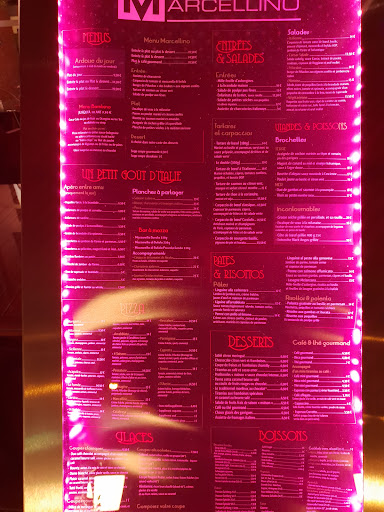 Read moreJe suis allée manger au Marcellino Mardi soir. Beaucoup de chose à revoir ! Serveurs trop pressés ! Ils nous on relancé 3/4 fois pour savoir si nous avions fais notre choix alors que mon amie et moi voulions prendre "l'apéro" avant de manger. Pas de pain proposé à table pendant notre repas. Menu pates à revoir ! Presque que des Linguine alors que je n'aime pas ça, très peu de choix avec les autres pâtes.. J'ai pris le risotto aux gambas et burata. La mozzarella est posée entière, grossièrement au dessus dune montagne de riz jaunâtre avec deux gambas qui se battent en duel.. Riz Fade et Gras !! Un gout de beurre vraiment écoeurant. Gambas non décortiquée en trop peu quantité et mozzarella encore plus fade que le riz et inutile au plat. Choix des desserts décevant ! Étant une grande fan de chocolat , seul dessert au chocolat est le traditionnel fondant au chocolat( non fais maison bien-sûr ). Aucun goût, une honte. J'en ai mangé des congelés picard meilleur que ça ! Mon amie satisfaite de sa pizza à pourtant été déçu par sa coupe de fraise et framboise avec de la chantilly. Les fruits n'étaient pas sucrés donc fades. Prix de l'adition 55 euros et des poussières.