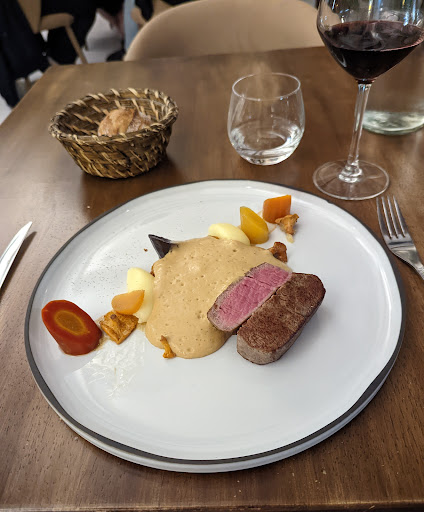 Read morePour commencer Parking et stationnement à proximité donc très bon point. Très bon accueil. Cuisine succulente et digne du Chef ainsi de même pour les desserts. Donc 1 très grand point pour ce restaurant. Les assiettes ne sont pas très copieuses mais très riche en calories ce qui fait qu'arrivé à la fin du dessert on est rassasié... Dommage que le pain est servi en très petite quantité en accompagnement et donc fait un peu défaut.... Ensuite la serveuse énumère la recette et ingrédients du plat de façon exhaustive voir par cœur mais sans conviction car elle peut commencer à la première personne servie puis finir sa citation à la 3ème personne servie....ce qui ne donne pas toute sa valeur au plat et surtout ne met pas en valeur le travaille du chef... il manque ce petit charme en montrant ou énumérant les ingrédients directement au client... dommage... Après cela est mon avis mais l'ambiance de la salle est froide de par son éclairage trop fort et sa décoration car elle est trop épurée de nappe , d'artifices tels que petit éclairage individuel ou bougie.... tout ceci pour vous dire que le sol est en béton ciré peint gris clair, les murs en pierre apparentes certes les poutres apparentes, le restant en murs blancs avec le plafond à 3,50m de haut ce qui rend le tout non chaleureux et/ou romantique.... encore dommage... De plus avec l'ambiance froide s'accompagne avec un manque de chauffage ce qui ne donne pas l'envie de s'éterniser car le froid se fait ressentir en fin de repas... Un très grand dommage... pour ce Restaurant digne dune cuisine de haut vol qui pourrait être l'endroit le plus réputé de ses alentours et qui mériterait le détours.... Car on ne peut miser que sur sa cuisine.... Donc ceci explique ma note seulement de 4 étoiles qui pourrai largement passer à 5 avec quelques petites touches intérieures et de présentation....sinon tarif presque raisonnable mais qui pourrait être également justifié par l'ensemble de mon...