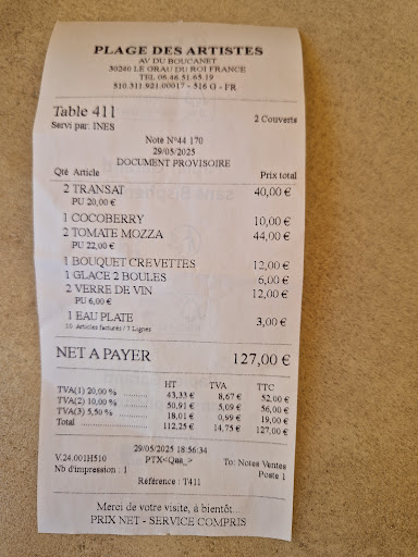Read moreHabitués à une paillotte pas loin de celle ci nous avons voulu changer .... Et bien ... Nous n'aurions pas dû !!! Je n'aime pas laisser des commentaires pas positifs mais bon là.... Nous n'étions pas au courant que la soirée c'était obligatoirement plat unique barbecue viande ( petits pilons de poulet et minis ribs avec clairement très peu de viande ) ou poisson. Servi avec des frites , certe le tout à volonté mais à 25 euros par tête . Nous avons trouvé ça très excessif et surtout dont la façon que le serveur à eu de nous expliquer .. Nous demandons de l'eau et là surprise ! 2 euros 50 la carafe d'eau du robinet !!!!!! Une honte . Faire payer l'eau du robinet !!! Nous avons pris un apéro mais au vu du prix du plat et de l'eau nous n'avons pris aucune autre boisson .heureusement qu'au niveau gustatif la qualité y est ( niveau dessert et frites , car la viande j'ai eu beaucoup de morceau de ribs ... Cramés !) mais sur le prix il va falloir ,je pense, essayer de se remettre en question même si je sais que tout augmente de nos jours . Je trouve ça dommage également d'obliger le plat unique barbecue.... Le personnel , est resté tout de même professionnel malgré le manque de sourire pour certain, mais honnêtement nous ne reviendrons pas à cette paillotte qui nous a déçu...