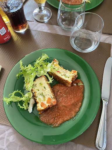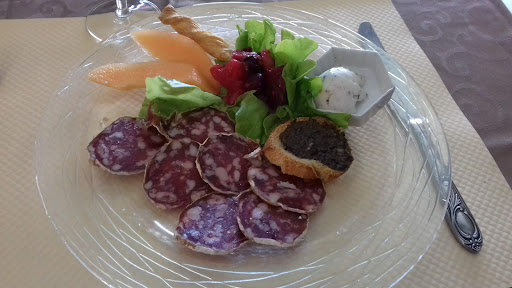 En entrée 4 tranches de saucisson de Toro avec 3 feuilles de salade , une mini tranche de pastèque amère et le top un toast soi-disant de tapenade mais ce n'était pas du tout ça, c'était du pesto froid 🤣😂, signalé à la serveuse qui devant nous le dis à la cuisinière mais aucune réaction 😱