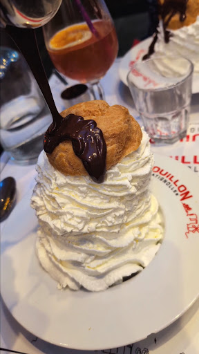 VisitĂ© une nouvelle fois en septembre, car c'Ă©tait le seul resto ouvert un dimanche soir. InstallĂ©s en intĂ©rieur, nous avons pu observer le travail du serveur. Il porte des gants de cuisine car il fait la dĂ©coration des assiettes, mais il sert aussi, avec ces mĂȘmes gants, et ajuste aussi le sac poubelle qui est Ă cĂŽtĂ© de lui. Il fait toute la soirĂ©e avec la mĂȘme paire de gants, va dehors, manipule des poignĂ©es de portes, et va certainement aux toilettes avec. Bref, sur l'hygiĂšne, il y a une bonne marge de progression ! J'ai testĂ© les bouchĂ©es Ă la reine, mais c'est juste hors de prix pour un bouillon, autant aller dans un vrai restaurant. La purĂ©e qui accompagnait Ă©tait certes trĂšs beurrĂ©e, mais pas du tout salĂ©e, donc...