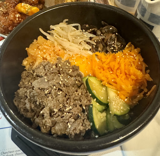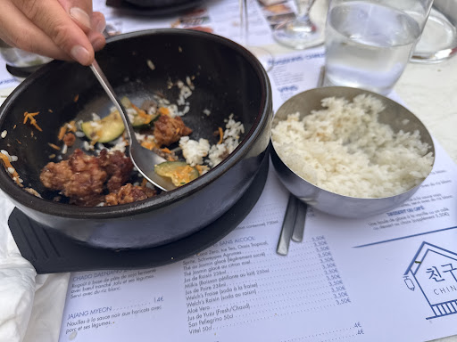 Pas mal, mais ... Plusieurs choses à améliorer : 1/ Le poulet frit a bon goût, mais c' était beaucoup trop salé. Je pense que c' est parce que vous utilisez de la sauce soja normale au lieu d' une sauce soja épaisse sans sel, faite pour cuisiner... 2/ en dehors du goût trop salé, le poulet frit est très fade comparé à du vrai poulet frit coréen. Là il y a la texture grosso modo, mais pas le goût. Il n' y a pas du tout de gochuchang... Après si vous avez peur que ce soit trop fort, vous pourriez proposer une version réelle (avec gochuchang) et une version light ( sans gochuchang et avec du paprika ou du piment doux, comme ça, il y a le côté épicé, sans la force). 3/ le riz est une sorte de riz rond japonais, mais bas de gamme . Dommage, j' aurais aimé un vrai bon riz de qualité, avec des accompagnements de légumes (par exemple en option). 4/ la quantité de riz blanc est trop petite pour manger cette quantité de poulet frit. J' aurais préféré moins de poulet frit avec plus de riz , pour avoir un plat plus complet.
