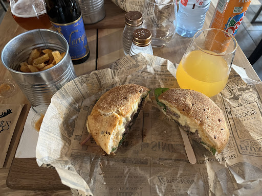 Read moreJe suis un peu déçu. Les frittes étaient dur très dur. Le service est top. Sympa. Malgré un remplacement des frittes, elles étaient mieux mais la moitié des frittes restaient dur. Impossible pour mes dents de croquer ça. Conseil au propriétaire : changez les frittes, l'huile ou leurs tailles. Ils sont bcp trop petits et durcissent trop vite à la cuisson. Servir des mini frittes dans une boîte de conserve avec une mini fourchette en bois c'est horrible... N avez vous jamais testé manger vos propres frittes ?? Les manger c'est vraiment pas simple. Mettez vous a la place de clients pour ce prix il faut des frittes croustillante FACILE (car trop petites au fond de cette boîte) à manger et goûteuses. Ce n'était pas le cas. 2x.... Le sandwich incroyable. J'aurai préféré un peu plus salé. Par contre la sauce mayo est a changer. MAIS POURQUOI MON BURGER ÉTAIT COUPÉ EN DEUX ?? En terme de quantité, il aurait pu y avoir une vraie tranche de tomate et une bonne salade... La linguette était une très bonne idée. Soyez pas radin sur le sopalin par contre.