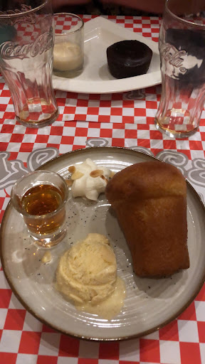 Autour de nous, des habitués. Pas de chichis, un vrai bistrot de quartier avec une ambiance comme on les adore. Pas de carte mais des ardoises accrochées au mur qui font tout à fait le job. Elles créent meme du lien puisque nous nous retrouvons à discuter tout naturellement avec les clients à la table juste dessous. Chacun trouve un plat qui le tente. Il y a du choix, des viandes, des abats, du poisson, des tartares, des plats végétariens... parfait ! Nos assiettes arrivent. Poulet zeitun, émincé de volaille et burger le tout accompagné de frites et de pâtes au programme. Très soignées, elles sont des plus appétissantes. On les déguste déjà avec les yeux. Les plats sont succulents, les cuissons parfaites, l'assaisonnement au top ! Et que dire des frites maison ? Délicieuses !!!! Un petit dessert ? Nous nous laissons tenter par des babas au rhum, un fondant au chocolat et une soupe de fraise. Les babas sont faits maison. Je n'en n'avais jamais vu de tels : énormes et dé-li-cieux ! Il n'en restera plus la moindre miette (ni goutte). La soupe de fraise de toute évidence faite maison était à tomber et le fondant juste parfait !