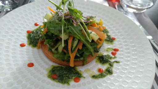 Zum Restaurant: Hier gehen mir wirklich die Superlativen aus. Angefangen beim sehr guten Service. Die Damen waren sehr aufmerksam, sind auf alle meine Wünsche adäquat eingegangen, haben mir sehr gute Ratschläge für die Menüwahl gegeben und hatten alles und jederzeit im Blick und im Griff. Ich staunte über die filigrane Verarbeitung der Lebensmittel, das handwerkliche Küchengeschick, die Auswahl der Speisen und das pure Geschmackserlebnis. Ich hatte mich für ein Menü entschieden, bestehend aus Lachs auf Kartoffeln, Kalbsniere mit Kartoffelstampf und Rösti, Eisvariation. Die Speisekarte wurde auf Tafeln geschrieben, sodass davon auszugehen ist, dass eine regional, saisonale Küche vorliegt.
