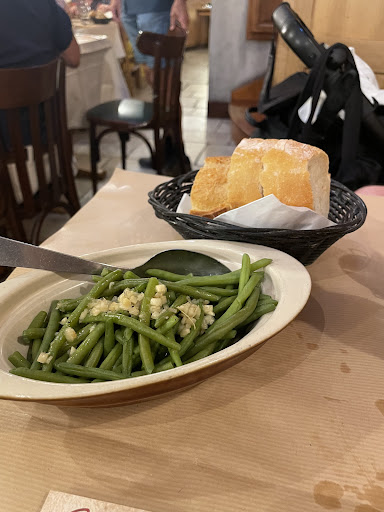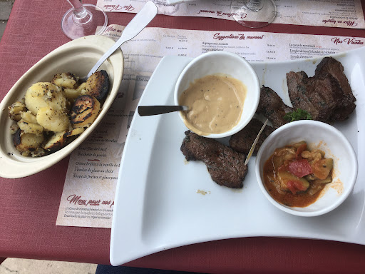 Visited again after a 20 year break and I remembered it well. That alone tells you something. It's been open since 1975! In mid afternoon and when we returned early evening,it was very busy. Had a lovely buzz of conversation (we should wean ourselves off phones for a while) And many were not only French but also locals. The aroma of good food was a big draw as well The interior is long and narrow. With the kitchen half way down, so you can see the food being cooked and prepared. An oddity was the tv screen viewed outside showing a big pizza like oven (Not on the menu for once) And you can watch the live activity as dishes were cooked. There was lots of outside space, mostly under cover. This expanded as more diners came pleading for a table Initially the MaitreD said he had no space but as he turned away, he called us back. The fairly concise yet varied menu, (but not for vegetarians) boasted of the quality of the meat served, especially beef. Unusually the menu is printed on the paper place setting. I went for the 3 course set menu at €27.50 The 2 teenagers in our group were very happy with their food. The Camembert which had been oven cooked, was well presented and appetizing. We all tried it! My salad based starter including lardon pieces was demolished with relish. I and another in our party had a beef brochette. The meat was excellent and cooked as ordered and well presented with a sauce and greenery. Finished with a peach melba type dessert. No tins allowed. Fresh sliced peaches, rich ice cream, raspberry sauce, topped off attractively. All savoured and dish emptied. Had a bottle of the cheap Rhone at €21. Very smooth but not to my taste. The waiting staff and therefore Also the cooks worked extremely hard to deliver efficiently. Even though diners kept coming until 10. And engaged with us when they could without interrupting with the standard "how was your meal". "Check the plate" often being my response.