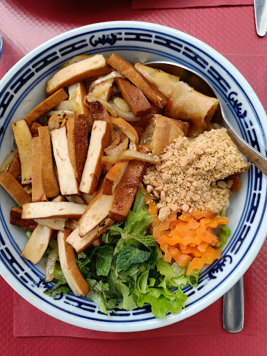 Rouleaux de printemps :pâtes, salade, menthe 1.5 crevettes... Un peu Light Samoussas que de légumes bien épicés. Boulettes de poulet ? Plutôt galette de légumes même si bonnes Nems basiques Boeuf basilic correct, riz bof Pad thai trop sucré... Même en rajoutant les cacahuètes et tout le piment.... Bref très déçue et c'est rare