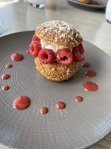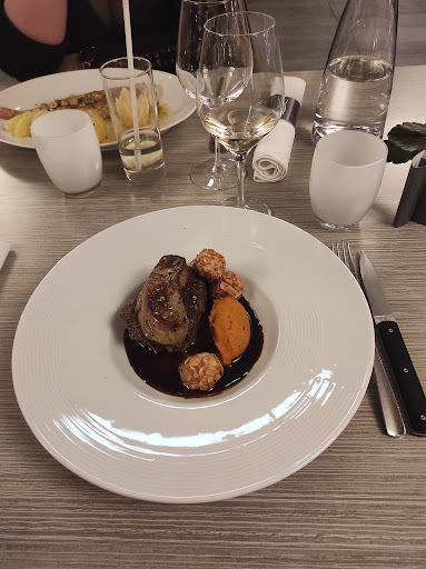 Read moreUn peu déçu de mon passage dans ce restaurant. Voici les points positif et négatif au fil du repas. Pour l'apéritif, nous avons pris 2 coupes de champagnes (15€). 1ère surprise, pas d'accompagnement avec l'apéritif, à moins de prendre quelque chose sur la carte. Ensuite, nous avons choisi tous les 2 le menu à 55€ avec le supplément fromage pour 5€ de plus. Sur ce menu, pas de plats au choix : 1 seul entrée, 1 seul plat (poisson), 1 seul dessert. Arrivée de l'entrée rapidement : foie gras à l'anguille fumée. Très bon, belle présentation. Nous sommes surpris qu'il n'y ait pas eu au par avant de mise en bouche. L'enchainement des plats se fait à une bonne vitesse ni trop vite ni trop lentement. Le plat : st Pierre était très bon. Le fromage : un morceaux de comté de taille correct très bon Le dessert : transparence de fraises aux épices. Bon en fait une verrine avec un un biscuit au fond, des fraises sur les bords, un sorbet fraise, de la crème montée et un disque chocolat sur le dessus. Dans l'ensemble bon mais rien d'extraordinaire. J'ai été plus impressionné par les dessert à la carte que j'ai vu passer sous mes yeux. Pour accompagner notre repas, nous avons pris du vin au verres (3 pour moi, 2 pour ma femme). bien servit, bon vin, bonne qualité et tarif correct (9€ le verre de 12 cl). Au final une note à 200€. Pour ce prix, je m'attendais à un peu plus. Je ressors avec l'impression qu'il vaut mieux prendre à la carte que les menus mais le prix s'en fera ressentir du coup. Le parking mériterait un peu d'aménagement, il n'est pas à la hauteur que du restaurant. Et pour finir sur une bonne note, le cadre est superbe. La salle du restaurant donne, en léger surplomb, sur les...