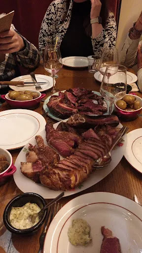 On Saturday evening, it's not the regular full menu, it's tapas-style starters, with then a choice of two types of steak for the main course, and you choose your own size. As we were a big group, we got large both steaks to share, and they were...
