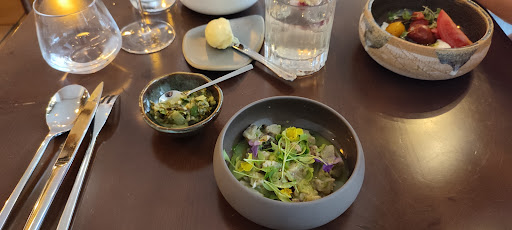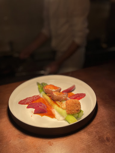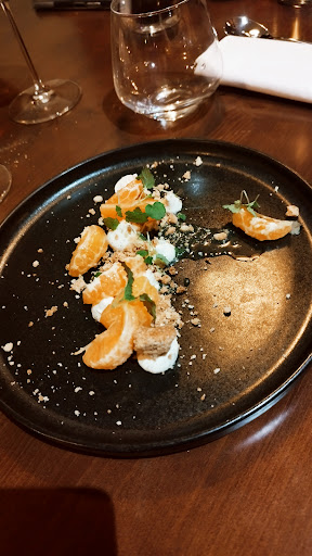 Une délicieuse soirée chez Elma ! Niché au fond d'une petite cour pavée elle-même adorable avec ces guirlandes ginguette, on entre chez Elma et on a envie d'y rester comme dans cocon chaleureux (la bande-son y contribue, les bougies et les fleurs également) ! Maxime et Elena prennent le temps avec l'ensemble des clients, de présenter la carte, de conseiller sur les accords mets et vins, de répondre aux questions sur les cocktails (coups de cœur pour le Mezcal Chartreuse et le Mezcal Mule). En entrée, les asperges vertes et leur pesto pistache valent vraiment le détour. En plat, la cuisson du cochon comme du maigre est parfaitement réussie, comme celle des légumes rôtis. Que dire du pain d'une grande qualité et du beurre d'accompagnement fumé à l'olivier ô combien gourmand (se mange clairement sans faim et sans fin...). Comme pour le choix des plats (suffisamment large pour qu'il y en ait pour tous les goûts, suffisamment ajusté pour garantir la qualité des produits), vous serez comblés par les propositions de desserts : nous n'avons pas gouté les fromages mais le dessert triple chocolat comme le dessert à l'abricot étaient succulents. Egalement une très jolie sélection de vins appréciée grâce aux conseils d'Elena. Typiquement le genre de restaurant encore un peu caché, qui est un bijou, et où nous aurons un grand plaisir à revenir, y compris pour tester le midi. Le tout pour un rapport qualité - quantité - prix raisonnable et juste. Un charme fou dans l'atmosphère comme dans l'assiette. Merci et à très...