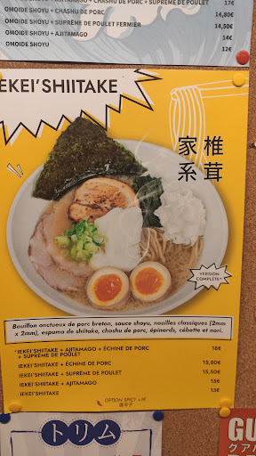 On a commandĂ© 2 ramens, une portion de karaage et une de gyozas. Au niveau des prix, c'est assez onĂ©reux, mais le principe est le meme que ramen ya. Tu dois forcement prendre un supplĂ©ment Ajitamago car il n'y est pas de base. Et pour ikimasho, Ă 12⏠tu n'as ni chashu/supreme de poulet, ni ajitamago. Pour le karaage, il n'y a pas de sauce par dĂ©faut. C'est en supplĂ©ment. Ils bon OK. je trouve personnellement que ça manque de gingembre. Et pour les gyozas, on a le droit Ă la sauce soja de base. Et ils sont bons. Les ramen choisis : IEKEI'Shiitake @ 18⏠et le OMOIDE SHOYU @ 17⏠Celui que j'ai mangĂ© est le iekei shiitake. l'espuma etait bon. On sent bien le champignon. Bon point. Le porc est fidĂšle Ă ramen ya, bien que mon morceau nâĂ©tait pas trĂšs grillĂ©. Le poulet Ă©tait bon. L'oeuf etait bon Ă©galement, rien a dire lĂ dessus. Petit dĂ©tail pour la cebette, il faudrait la couper un peu plus finement. On n'a peut etre pas eu de chance mais c'etait coupĂ© Ă l'arrache ^^ LĂ oĂč cela se complique c'est pour le bouillon et les nouilles. Et c'est les Ă©lĂ©ments principaux dans un ramen... Je n'ai pas aimĂ© les nouilles. Elle manque de goĂ»t et la texture me dĂ©range. J'ai la mĂȘme sensation chez ramen ya. C'est ce que j'aime le moins. Les 2 bouillons n'etait pas mauvais, mais ça manque d'odeur, de goĂ»t. Au gros on n'a pas du tout d'UMAMI que l'on est censĂ© avoir quand on mange un ramen. C'est surement suffisant pour dĂ©couvrir les ramen, mais si vous voulez vraiment connaitre cette 5eme saveur qu'est l'umami, c'est pas ici que vous l'aurez. J'ai gouter tous les restaurants ramen de Nantes, et celui qui est Ă 50m est incomparable en terme de prix (environ 5⏠de moins), mais surtout de goĂ»t, d'umami...