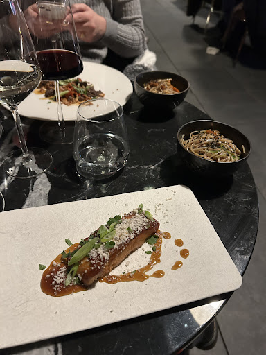 Read moreNous y sommes allées entre copines et avons très bien mangé. Petit souci ce mois ci avec l'absence d'un chef cuisto qui a fait que nous avons été servies, pour l'entrée, au bout de 50 mins. Mais le plat est arrivé un peu plus rapidement. Le personnel nous a informé que nous étions arrivées en plein rush donc nous avons compris. Les plats sont très légers, ce qui est top. Mais, cela pousse aussi à prendre entrée/plat/dessert pour être bien calé. À prévoir dans votre budget! Les plats sont bons, le prix est vraiment correct et à la hauteur de ce qui est proposé. Les nouilles sautées sont excellentes et j'aurai aimé en manger encore plus. Ça n'est pas non plus incroyable en terme de goût mais on voit qu'il y a de l'effort et de la "recherche" pour nous apporter des saveurs différentes de ce qu'on connaît. Nous avons été super bien conseillées pour le vin, mon amie a pu en goûter 3 avant de faire son choix. Ce qui est vraiment chouette. Le personnel est très agréable et observateur, donc ils savent quand vous avez besoin qu'il vienne prendre votre commande et récupèrent très rapidement les assiettes/verres vides sur la table. Le restaurant est magnifique, les toilettes aussi. Nous avons particulièrement apprécié le fait qu'ils utilisent des petites serviettes pour s'essuyer les mains. Mention pour les robinets pas super hygiéniques avec la nécessité de "dévisser" le robinet pour faire couler de l'eau. Mais l'expérience est agréable. Notez que le parking souterrain est juste en dessous du restaurant et qu'on a 3 pas à faire pour en sortir et accéder...