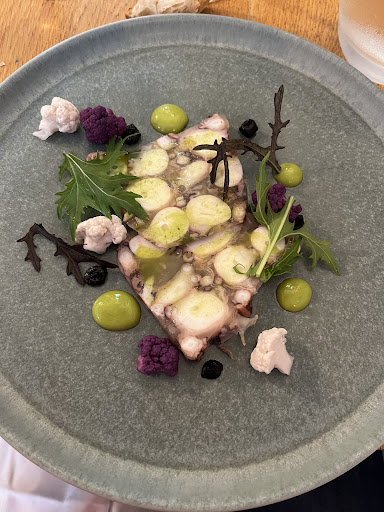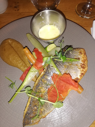 Magnificent meal. My favorite of four weeks traveling in Atlantic France, and we have been to many including two Michelin rated (which are wonderful but overwrought). Each dish used very fresh local ingredients combined in a fine balance of many components. A starter bouche, followed by a fresh open ravioli with complexity in perfect balance (a crisp, seafood foam, black sesame cracker, mushroom and celery sautéed with dollops of chèvre and other flavors). My main was a slow cooked rump that tasted like a tender tender flavorful short rib, with masterfully prepared trumpet mushrooms, squash mash, and other tastes and a beef au jus, all in a balanced and complex flavor. My wife had the fish shown which was also superb. A pre-dessert bouche of an ice cream ball with chocolate and hints of anise. Dessert was a haute apple dish of complexity and balance: minced green apple with an apple foam and apple sorbet and smatter of fresh apple sauce, caramelized sugar crisp, and cinnamon (?) sugar granules. Just fantastic! Ended with a cafe noisette, and went home quite happy. Very friendly...