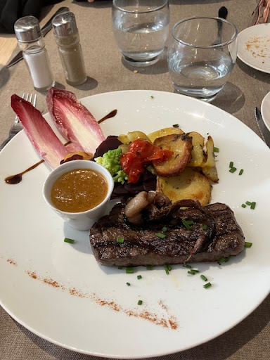 Read moreNous y sommes venus avec nos enfants sur recommandation de nos amis pour notre mariage. Une réservation rapide par mail. Un accueil par un jeune homme très agréable. Agréablement surpris par l'ambiance et la décoration du lieu. Nous avions été déçu que la terrasse ne soit pas dressée par un si beau temps avec une si belle terrasse je trouve ça vraiment dommage car c'est l'atout du restaurant. Le service est de qualité avec un personnel sympathique. Concernant les plats : Une petite attention pour l'apéritif, nous avons eu une jolie assiette de canapé faite maison. Tous nos plats étaient bons néanmoins le pavé de bœuf Rossini, la viande était très dur. Ainsi que la viande du carpaccio de ma fille. Je pense que nous aurions du commander du poisson.