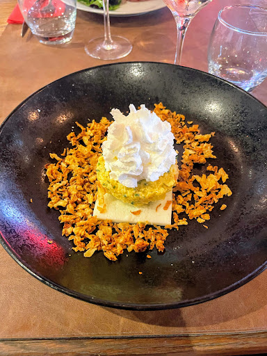 Read moreBonne accueil, le personnel est chaleureux et sympathique tout au long du service. Le décor agréable et original en bois. C'est une très bonne adresse pour les amateurs de viande et il n'est pas le seul plat proposé, du poisson aussi entre autre. Maître restaurateur on le voit très bien dans l'assiette, les produits sont frais et de qualité, la plupart fait maison. Le grillardin est venu nous voir à la table pour nous montrer la viande, une côte de bœuf, et discuter avec nous sur le temps de cuisson entre autre. Le même monsieur est revenu vers nous une fois la cuisson terminée. Nous avons apprécié ces moments et le service. Puis aussi le petit moulin à poivre, énorme en réalité. Cependant, concernant le vin nous avons demandé conseil et ensuite choisi de le suivre. Un AOP Languedoc rouge château de l'Hospitalet 2019 qui, selon la carte, a été le meilleur vin rouge du monde à l'international wine challenge du 2019. Or, ce vin nous n'a pas donné les émotions souhaitées : vin trop jeune, qui manque de structure et longueur en bouche. Il est rond et a tout de même un très bon potentiel mais qui reste vraiment trop jeune surtout associé à une côte de bœuf. Faites attention sur ce point s'il vous plaît. Les desserts sont très bon et malheureusement victimes de leur succès, ne sont pas tous disponibles. Il y a une carte à part pour les cafés, ce qui est admirable, dommage que les cafés crus soient noyés dans l'eau, ce qui amoindri leurs arômes. Nous avons vraiment apprécié ce restaurant et ce moment aurait pu être parfait, vraiment dommage pour le vin et le café. Cela dit, je conseille fortement...