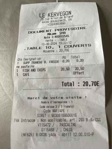 Read moreDe passage Ă Bouguenais ce midi, je suis allĂ©e dans le «seul » (donc pas de concurrence) restaurant du bourg. Beaucoup de monde mais on me trouve une table et on mâapporte la carte. (On ne me montre pas et on ne me parle pas des formules sur ardoise ⊠Je prends un Fish and chips Ă 20,50 euros (Ă ce prix lĂ je pense quâil va ĂȘtre dĂ©licieux) ; le poisson est archi-cuit et franchement pas terrible, je demande du citron pour donner un meilleur goĂ»t et on va me le facturer 0,20 âŹ, les frites me paraissent trop dorĂ©es pour ĂȘtre honnĂȘtes et effectivement trĂšs bof mais⊠la salade est bonne ! Je laisse la moitiĂ© de mon assiette et je fais part de mon insatisfaction une premiĂšre fois puis une deuxiĂšme fois quand je vais rĂ©gler⊠seule rĂ©ponse, on mâoffre le cafĂ© ! Bref, je...