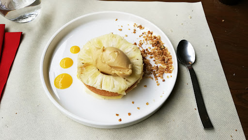 Une très très très bonne surprise ! J'ai tout adoré, de la mise en bouche jusqu'au dessert. C'était très savoureux, pleins de mélanges subtiles de saveurs. J'avais l'impression de manger à une table étoilée++ tellement c'était bien exécuté, mais pour un prix défiant toute concurrence. Nous avons eu la chance de bavarder avec le chef en fin de service, un homme passionné par son métier, les produits de sa région, investi dans une cuisine originale, de plaisir, de coeur. J'ai adoré le concept du menu mystère pour découvrir de nouvelles choses car il est vrai que je choisis rarement des plats nouveaux... Typiquement, je n'aurais jamais choisi le dessert : ananas poêlé, glace aux yaourt avec plein de pointes décoratives et gustatives (citron, coco) dans l'assiette. Mention spéciale pour ce dessert ! 😋 À n'en pas douter, je reviendrai goûter un autre menu mystère aux chants d'avril la prochaine fois que je passerai par Nantes. Il change...