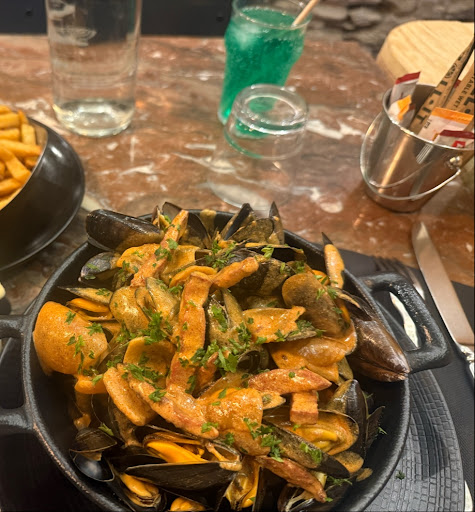 Une fois enfin à table, nous avons commandé un apéritif. Il est arrivé quand les plats étaient déjà servis. À ce stade, au lieu de nous ouvrir l’appétit, il nous l’a refermé. Le restaurant se dit spécialisé dans les poissons et fruits de mer. Soit. Mais ce qui nous a été servi relevait plus de l’archéologie alimentaire que de la gastronomie. Les moules étaient noyées dans une crème épaisse comme on n’en osait déjà plus dans les pires menus des années 80. Aujourd’hui, dans la cuisine moderne, la crème dans les fruits de mer est un péché véniel. Ici, c’est une fierté.
