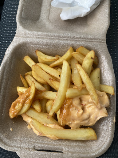 Quelques points négatifs néanmoins : la sauce est étalée directement sur les frites au lieu d'être fournie dans un petit pot, ce qui fait qu'elle se retrouve partout et rend les doigts très collants. De plus, une seule serviette en livraison à emporter, c’est un peu juste. Le repas était très sec avec peu de sauce à l'intérieur, les frites manquaient de goût et n'étaient pas assez salées. La viande avait un goût étrange, au point que je n'ai même pas pu terminer.