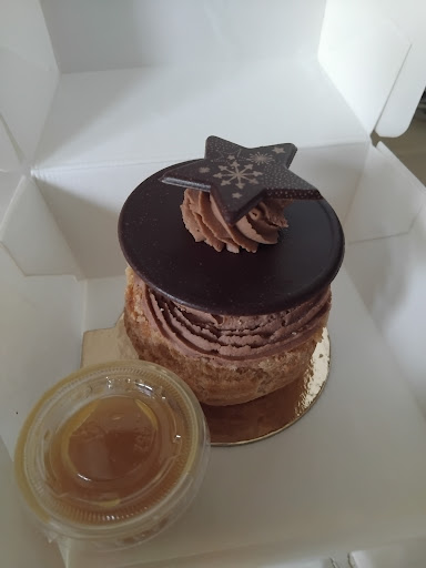 Read moreUn repas de réveillon à emporter absolument délicieux ... Délicieux avec un grand D ! Des parts tout à fait correctes, bien emballées, à un prix tout à fait correct aussi pour un repas de fêtes, très simple à préparer (même si les temps indiqués sont un peu juste, même si on dresse sur assiettes chauffées, mais une fois qu'on le sait, c'est facile à corriger) Comme je suis sympa, je vous mets juste une photo du "Chou craquelin au chocolat au lait et au fruit de la passion" encore dans sa boîte de transport .... juste pour vous faire mourir...