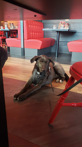 We were on a road trip and stopped by chance, but it was a great decision after all. There's free parking outside the restaurant. Service was great, even though we don't speak French they were very kind and friendly. We were traveling with our dog and were prepared to sit outside, but they told us we could come inside with her! The restaurant was clean, they have a lot of options to eat. You can get the menu with entreé, main course, dessert and beverage but we chose only main courses. We got the Bacon Burger and the Extra Cheeseburger, both with fries and a sauce. Both tasted good and came out quickly. The toilets were clean and stocked with everything. The restaurant has a small children's area where kids can play, and...