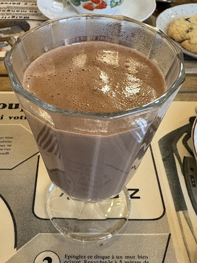 Nous avons pris un chocolat chaud fait maison (pour la recette du chocolat , je ne vous le dis pas car il faut y aller pour le goĂ»ter si vous aimez le chocolat ) jâen ai lâeau Ă la bouche rien que de vous en parler . Rien Ă voir avec les cafĂ©s du coin et un cappuccino avec 2 cookies fait maison aussi excellent et moelleux comme nous les aimons .