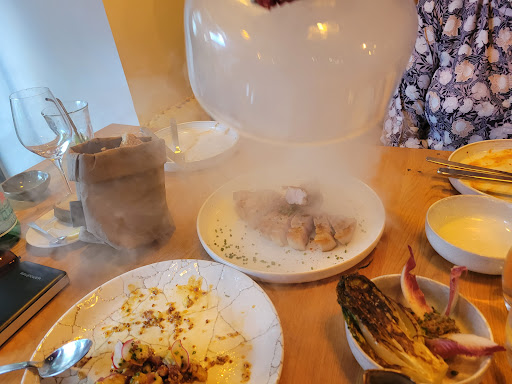 Read moreJe me suis basée sur les excellents avis de ce restaurant. Quelle ne fut pas notre surprise de constater que ce restaurant ne correspond pas du tout à ce qui est indique. A croire qu aucune des personnes ayant écrit ces avis n a déjà mangé dans un restaurant gastronomique ! Deux carrés d agneau froids, l un d entre eux était constitué aux deux tiers de gras qui est resté dans l assiette. Le ceviche de maigre était immangeable et il n a été mangé que le hummous. Le poisson est coupé en morceaux beaucoup trop gros, pas de saveur et sans caractère. Je n en ai mangé qu un morceau. Des morceaux de légumes crus grossièrement coupés en lamelles qui conviendraient bien pour des lapins. Même les pommes de terre grenailles n était pas bonnes et sans saveur et laissées dans le plat. Ce n est pourtant pas compliqué ! Quant aux desserts, la brioche perdue a été appréciée mais la soupe de fraise contenait des morceaux qui devaient être de la gélatine qui n avait pas fondu. Un verre de 5 cm de vin a 7€. Tout cela pour la modique somme de 102€ !! Ça nous reste en travers et je ne me fierai plus aux avis !!! La patronne ne s est pas inquiétée de savoir pourquoi mon assiette est repartie pleine et nous n avons même pas eu un au revoir de sa part. Quantité d autres adresses sont bien supérieures à celle ci quelques portes plus loin ; je vous encourage à vous orienter vers ces dernières. Je ne peux que vous dissuader de vous rendre dans cet...