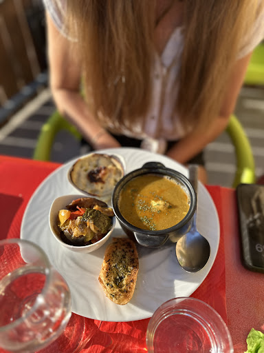 We got in with the children after reservation and we got a table at the terrace. The children received special children cups with straws. We decided to have the childâs meal for them with mussels as a starter. We ordered ourselves the 3 course menu. Both of us had the mussels as starter with a dry white Minervois, Thai curry chicken with rice, orange duck were main dish Because of the nice taste we just decided to have two more main courses. The faux filet with blue cheese and the lamb. As dessert the topical ice and the cheese with a moscatel wine. As stuffed as a Christmas turkey we walked home. Must try ; 3 course meal (enough food)...