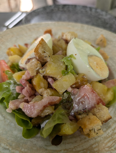 Stopped in for a quick lunch. Menu was small but inviting. Started out with Salade Vosgienne with lots sauteed lardons, croutons, potatoes and a hard boiled egg. Salade was big enough it could have satisfied most people for lunch- good thing we had opted to share it. We then ordered the Veal chop that came we a small green and French fries. Veal was extremely tender, but slightly overcooked to our liking. Service was quick, professional, and pleasant. Overall a great stop and...