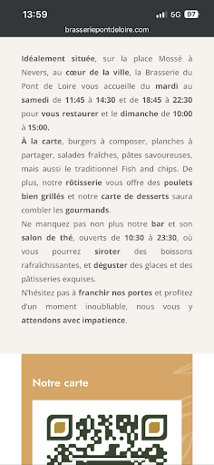 Read moreJe suis venue une première fois avec 2 collègues pour tester. Nous avons été installées rapidement mais le serveur était neutre, ni avenant ni désagréable. Nous avons demandé la composition de l'assiette rôtissoire (19€) et il nous dit que c'est agneau + poulet rôti, donc nous l'avons choisi mais au final on a eu agneau et filet de boeuf... Une de mes collègues avait commandé un burger avec une sauce au bleu (en supplément de 1€, ce que je trouve dommage) et au final nous avons eu toutes les 3 une sauce bleue donc petite erreur, mais heureusement elles n'ont pas été compté à la note. Le service a été un peu long et les goûts étaient normaux. Ayant eu quand même un avis mitigé, j'y suis retourné avec mon conjoint, c'est apparemment le patron qui nous a servi mais même chose que le serveur, il n'était pas trop souriant ni avenant. Nous avons pris un fish & chips (12€) et un burger. Mon chéri a trouvé pas trop mal le burger et le fish&chips allait aussi mais sans plus. Par contre, le service a été très long aussi, ils servaient des grandes tables qui étaient arrivées après nous et nous avons mis longtemps à être débarrassés. Résultat des 2 expériences, des serveurs pas très avenants, une nourriture correcte pour une brasserie mais qui n'a pas du tout la même qualité que les 3 autres restaurants de la même direction. Je ne pense pas revenir ou alors cela sera mon...