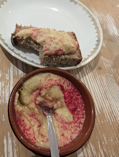 Malgré une mise en bouche et une entrée (velouté d'asperge) qui n'avaient pas d'intérêt gustatif, le plat (boulette de bœuf avec purée de poids cassé, carottes, fondue de poireaux et râpé de radis) quand à lui était très savoureux. Malheureusement, le dessert (tiramisu revisité) n'était pas à mon goût, il s'agissait d'un mascarpone local avec génoise, surmontée de différentes graines, le tout saupoudré de chicorée. Cela m'a fait penser à une crème fraîche avec du muesli, ce dont je ne suis pas friand.