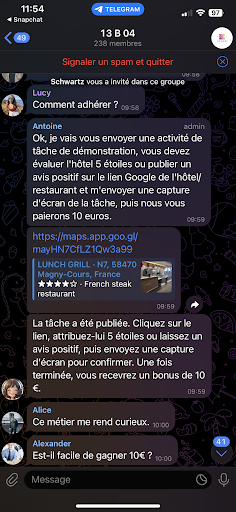 Je viens d'ĂȘtre inclus dans une boucle tĂ©lĂ©gramme dans laquelle des gens sont payĂ©s pour mettre d'excellents commentaires sur ce restaurant, et en lisant les commentaires et les notations de ce restaurant ça sonne assez faux, en comparaison avec les photos qui dĂ©crivent une petite brasserie sympathique, certains commentaires sont tellement enjolivĂ© qu'on croirait qu'ils ont mangĂ© dans un Ă©toilĂ© đ€Ł