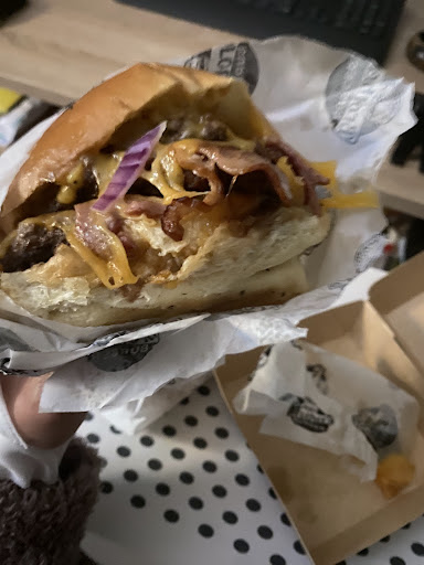 Livreur odieux, et insultant (17/11/23, vers 19h50). J'essaye pourtant d'être toujours correct / poli, et de les aider dans leur tournée. Je n'exige pas qu'il monte jusqu'à chez moi, je fais toujours l'effort de descendre en bas de mon immeuble, ce que je trouve normal et respectueux en considération de leur travail. Je l'ai précisé le plus clairement possible au téléphone à ce monsieur, à son arrivée devant mon portail. Il n'écoute rien, et je le retrouve dans mon hall d'immeuble (jamais invité à entrer...), à pianoter mon interphone (son attente n'a pas été supérieure à la minute, le temps que je descende...). Ensuite, sur le contenu, la commande est arrivée malheureusement froide, la boisson n'a pas été respecté et les frites (ainsi que les sauces) sont industrielles, ce qui est dommage pour ce type d'établissement ne proposant principalement que burgers et frites... le burger, notamment la viande, n'avait rien d'exceptionnel (steak assez fin et dont le goût rappelle celui du surgelé, et beaucoup de sauce dans la garniture...), mais le pain était bon. La commande en ligne était aussi pratique et assez bien faite, même si l'information sur 'l'état de la commande' semble juste de façade (elle est statique et...