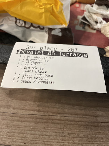 Read moreI order to be served on the terrace and after 15 minutes I went inside to check if something was wrong…so my food was ready on the try but 5 of them behind the couter "laughing and joking "they not even move when i went to take the try because it was my order number on it ! Not even apologize not even look at me . My chicken nuggets completely COLD! My double whopper cold!! no much sauce!! and the tomato was to thick!! And the fries they where hot yes but half of the paper bag!! Never will go back in this burger king again ! Bad bad bad