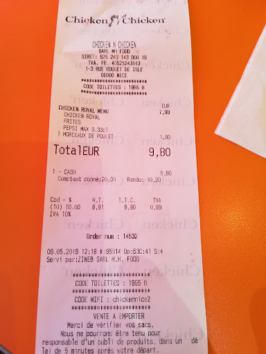 Read moreThe outside appearance & sitting area is very eye catching and appealing. Readily identifiable as HALAL (hallal or halaal). The inside is clean, appealing and very large. The menu items look very good. I went with the Chicken Royal, fries and can drink. One single fried chicken leg is 1.90 euro. The service was very slow but food finally arrived. The french fries looked delicious and were hot. I picked one up and bite into it and tasted fish. I waited and tried again still a fishy taste. The Chicken Royale gives the impression of a large chicken fillet. It's two (2) small chicken strips with a gap between them. The potato pancake I guess covers up the lack of three strips. Oh and they sell fish sandwiches. The wifi didn't work and the toilets were out of...